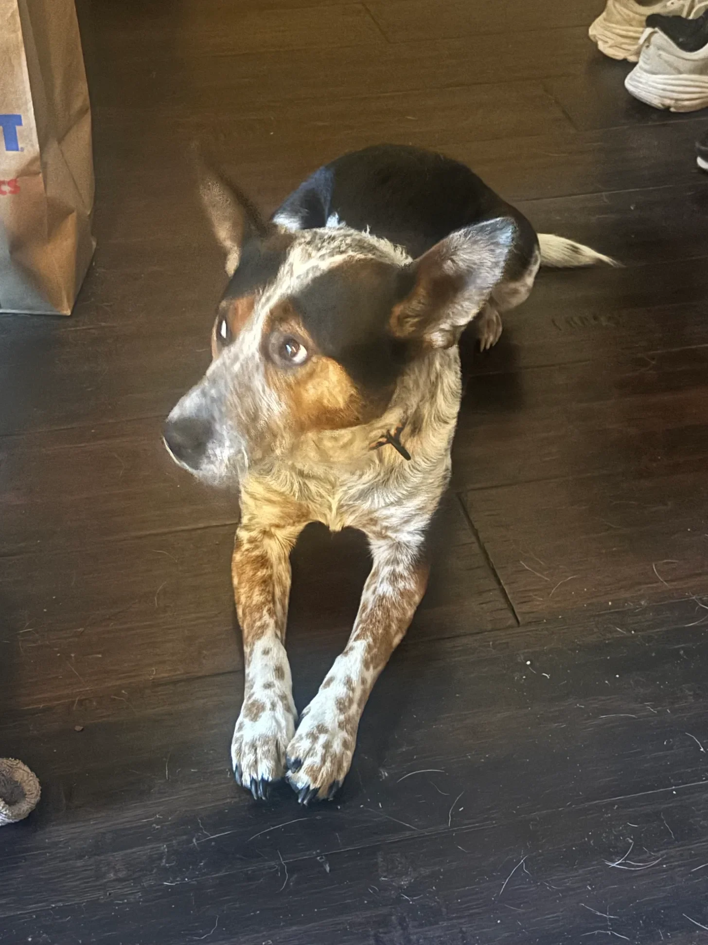 Picture of the visitor pup lying down and looking wistful.
