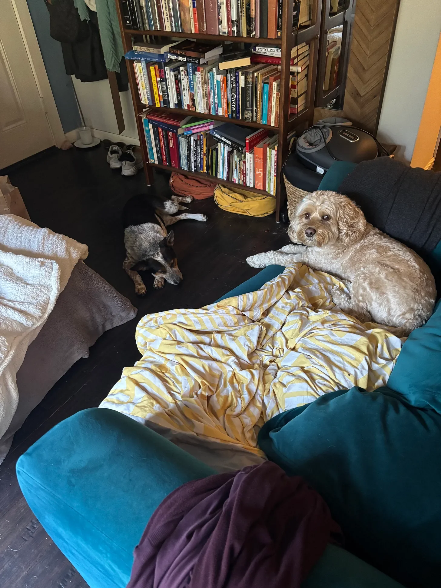 Picture of Pema sitting on the couch and looking at me like I’ve disappointed her, while Cleo lies on the floor being completely mellow. My piles of books are in the background.